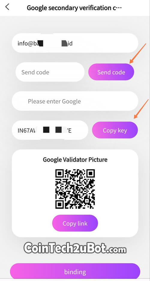 - Cek email > copy 6 angka code dari CoinTech2u > paste atau ketik 6 angka di kolom send code.